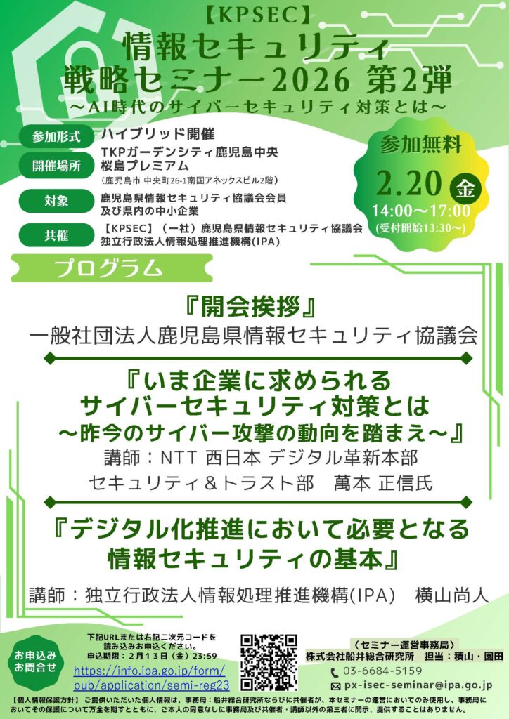| 共催 | 【KPSEC】(一社)鹿児島県情報セキュリティ協議会 独立行政法人情報処理推進機構(IPA) |